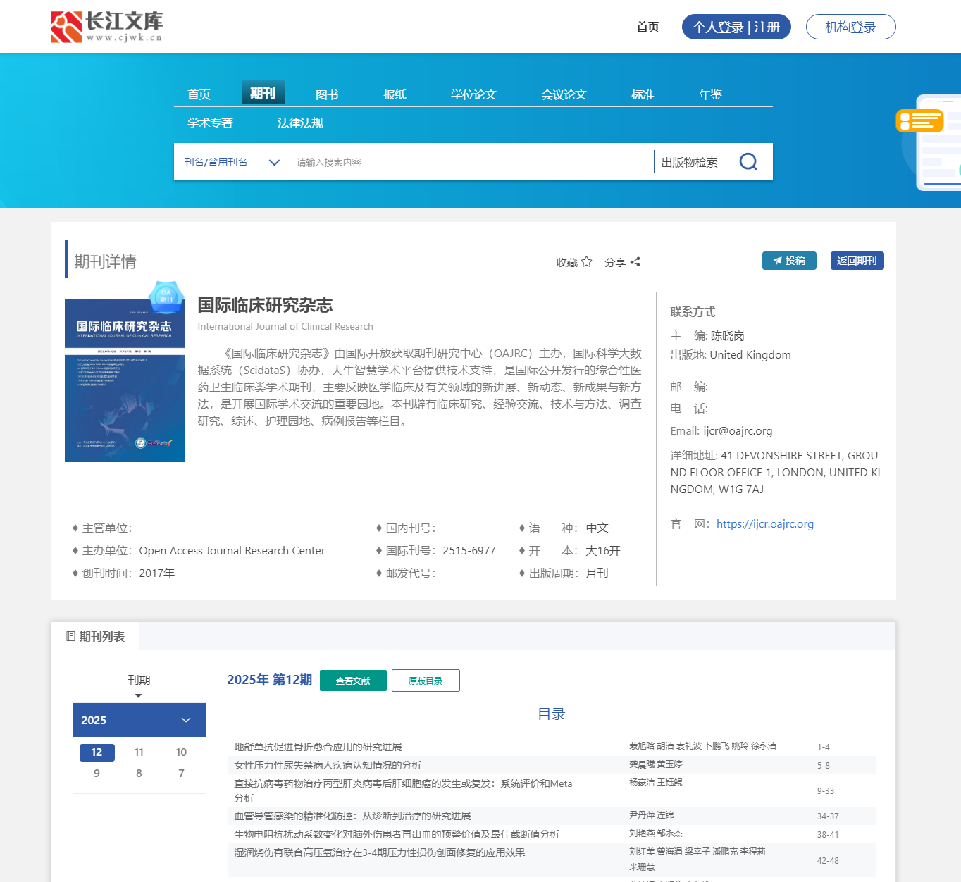图二:《国际临床研究杂志》在长江文库中的检索详情页截图